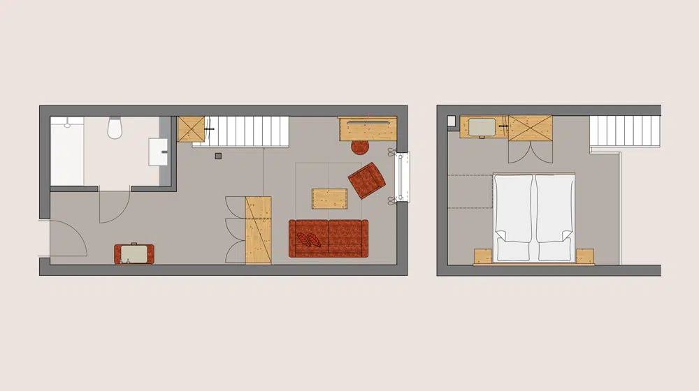 - Treppe vom Wohnzimmer zur Schlafgalerie mit Doppelbett